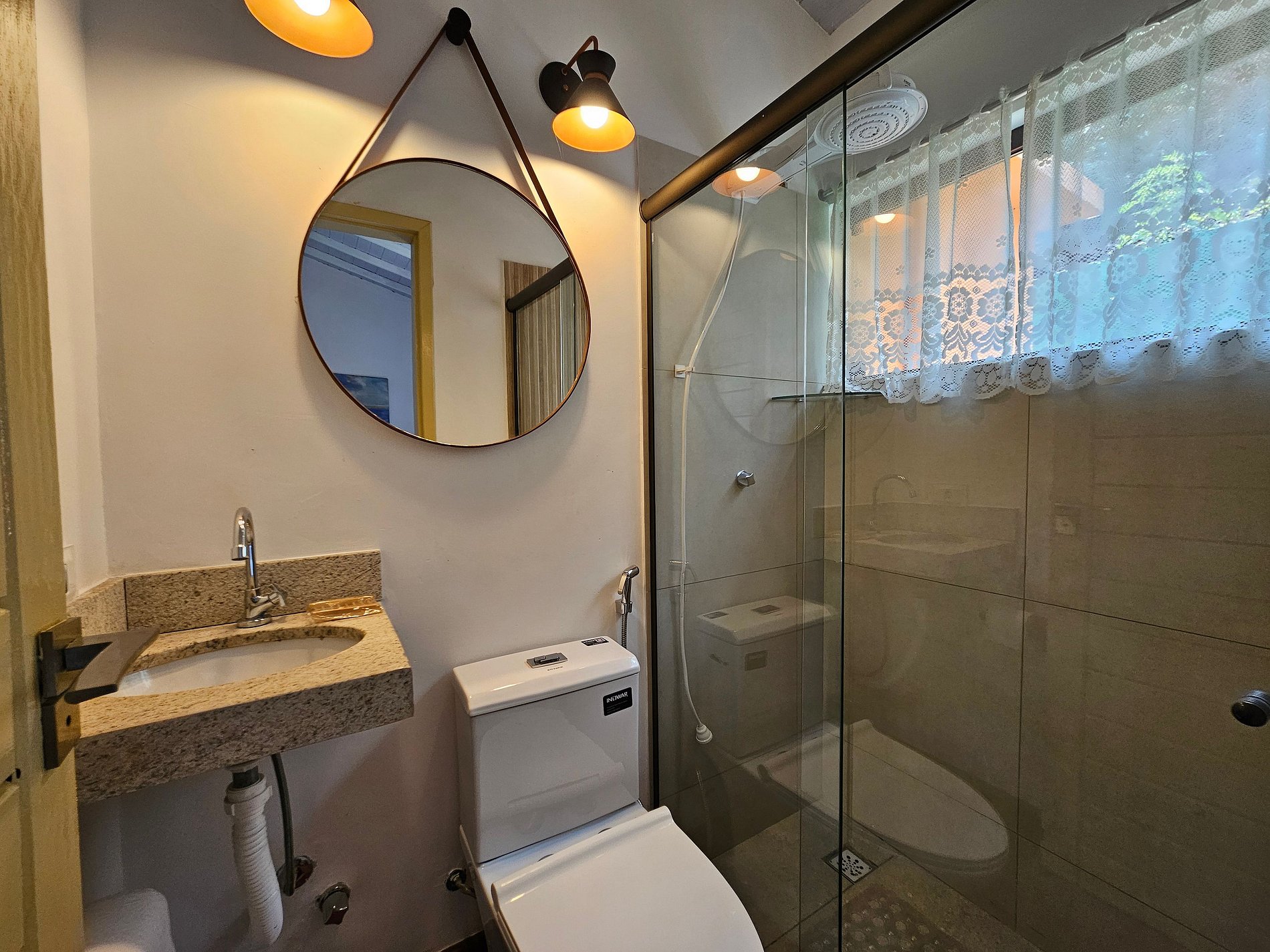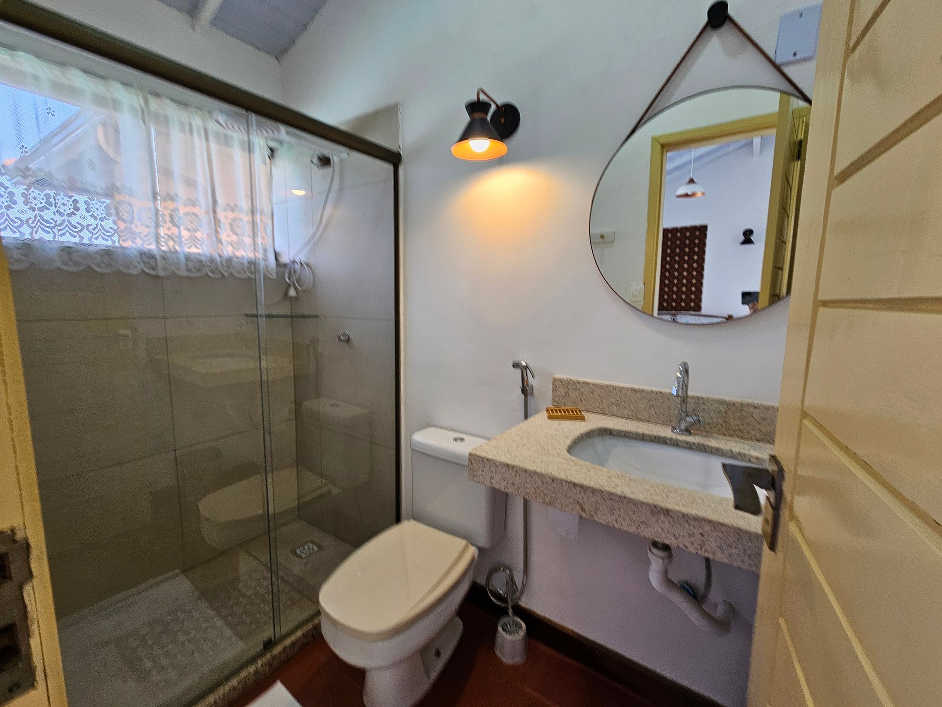 São 4 suítes, sendo 3 com cama de casal e uma com duas camas de solteiro. A suíte com camas de solteiro pode ser acessada diretamente da parte externa da casa e ficar independente da parte interna.