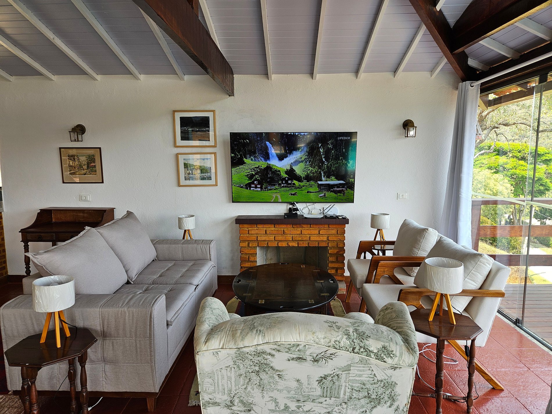 A ampla sala integra sala de estar e TV com lareira, mesa de jantar grande para todos e cozinha completa. Além dos banheiros em todas as suítes, há um lavabo. A garagem coberta recebe 2 carros, mais até 2 carros no pátio em frente.
