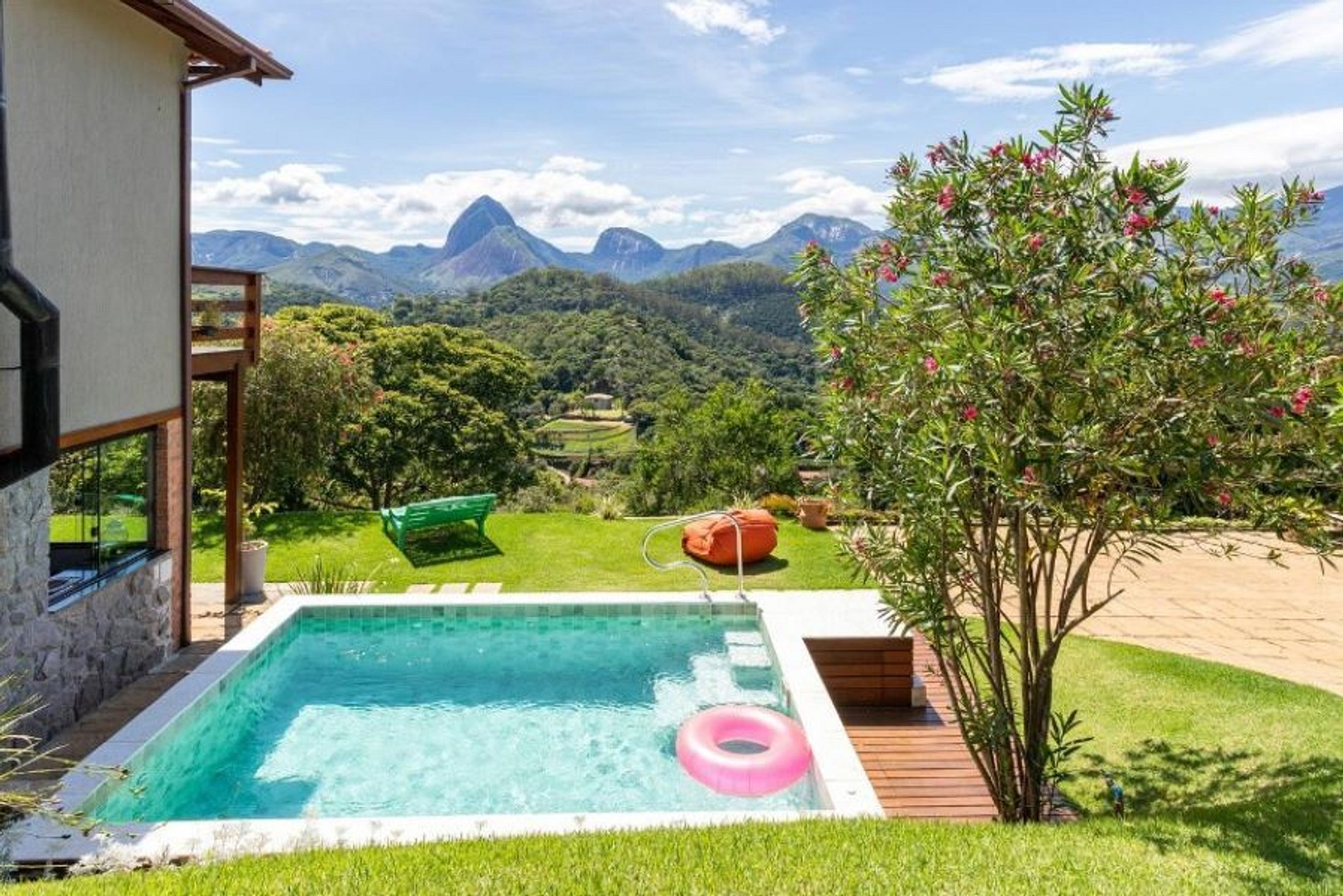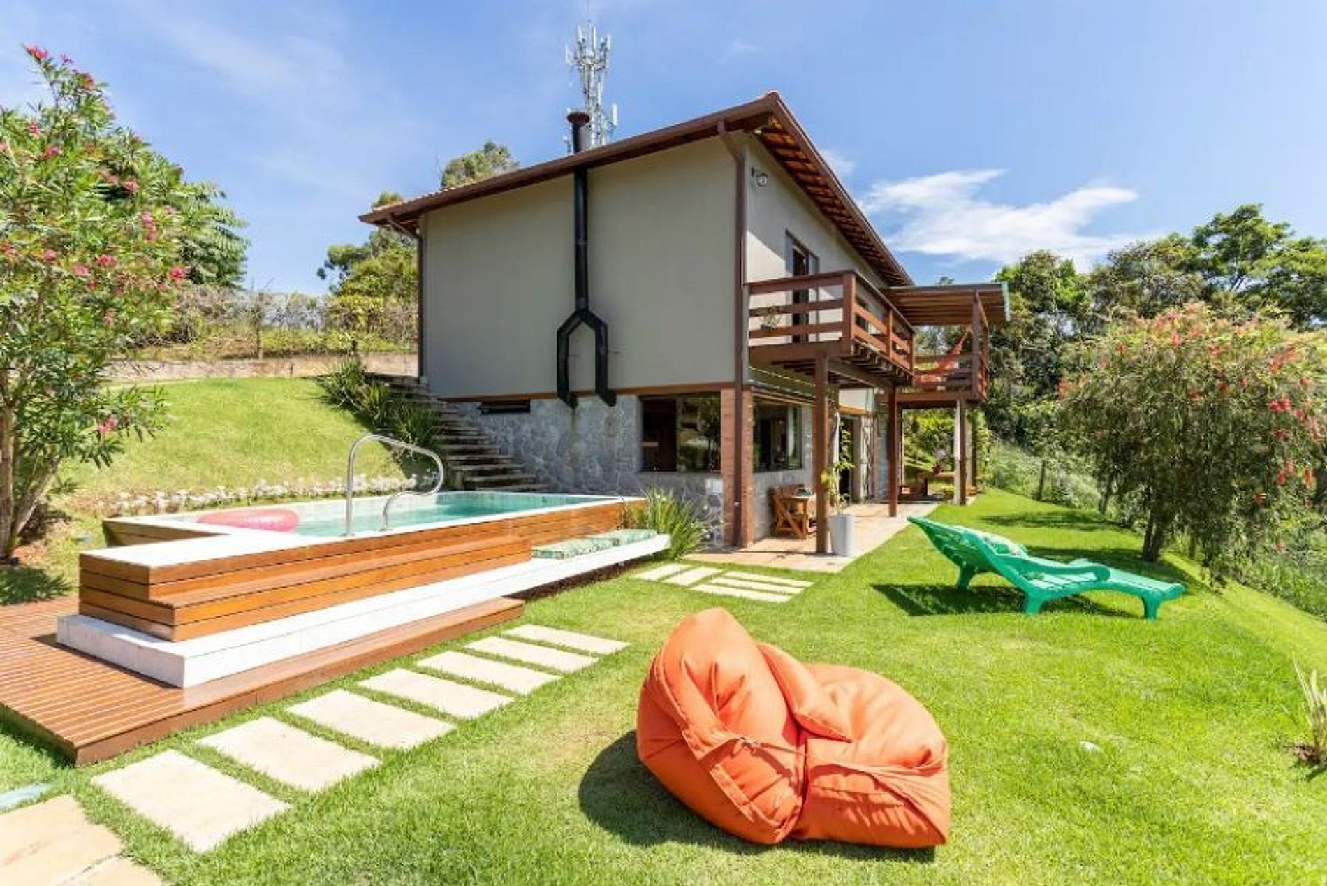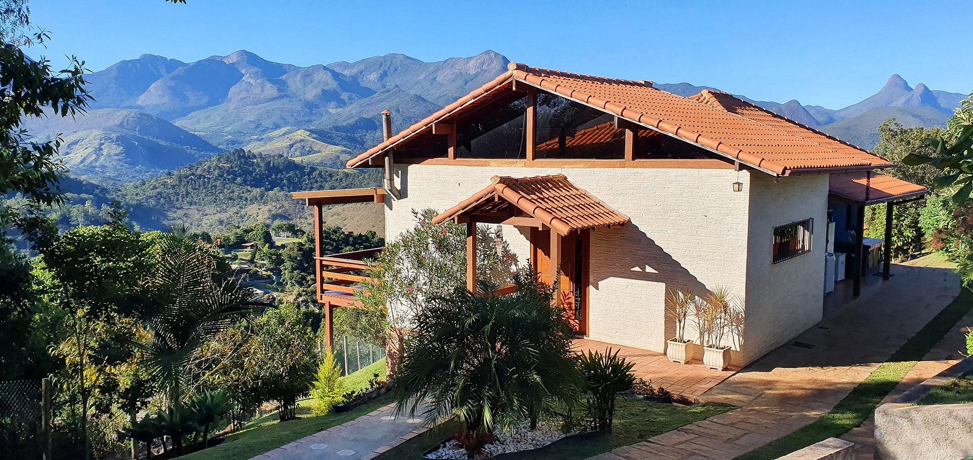 Casa muito boa. Bons lençóis, ótimo chuveiro, vista linda mesmo, cozinha completa, quartos com ar split quente e frio, sossego total. À noite o varal de luzes ao ar livre é muito agradável. E de dia a piscina e espaço de lazer são ótimos. A casa fica no topo de um morro e o acesso foi sossegado. A vista é espetacular.