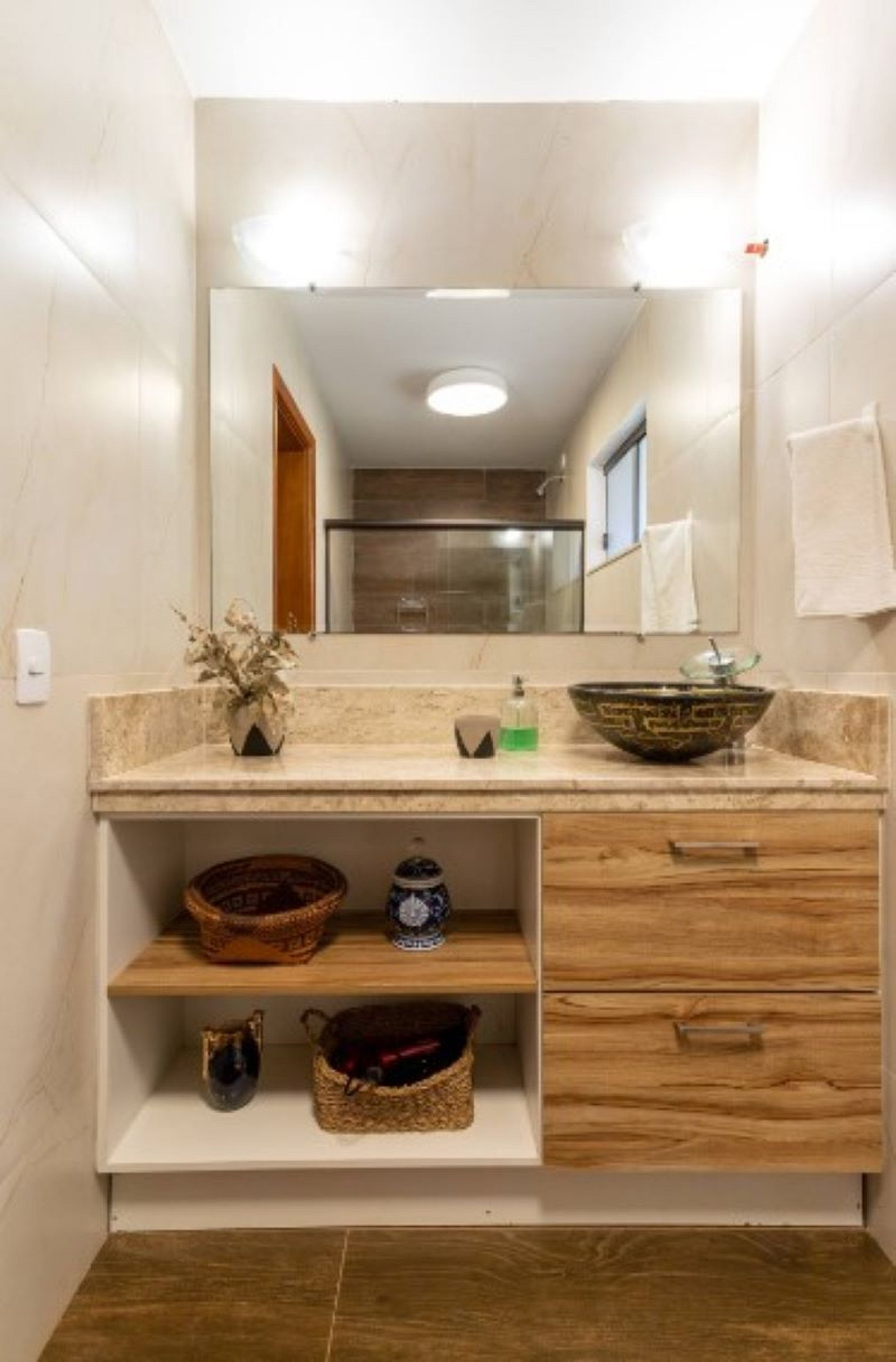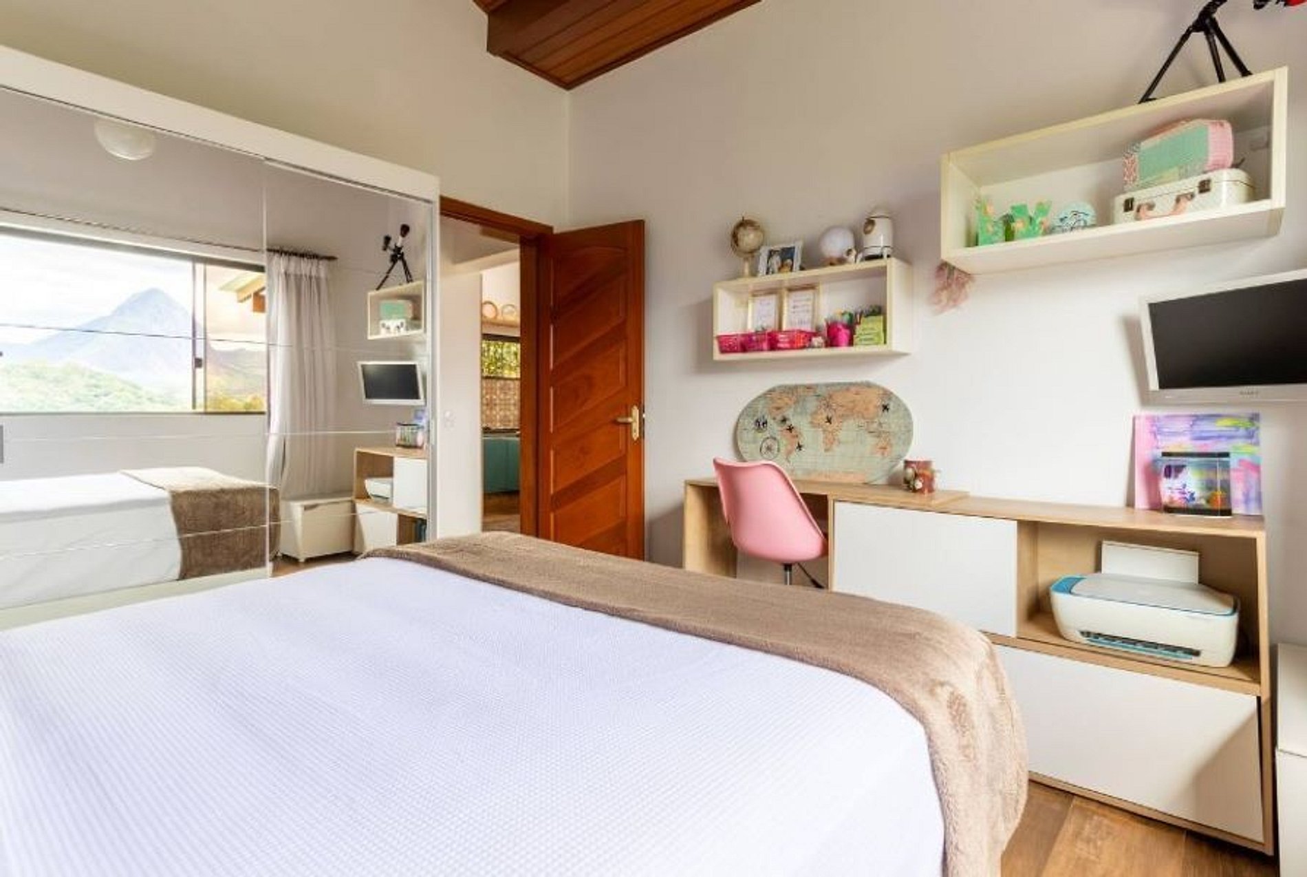 - Três quartos com cama de casal, sendo um suíte com cama queen size