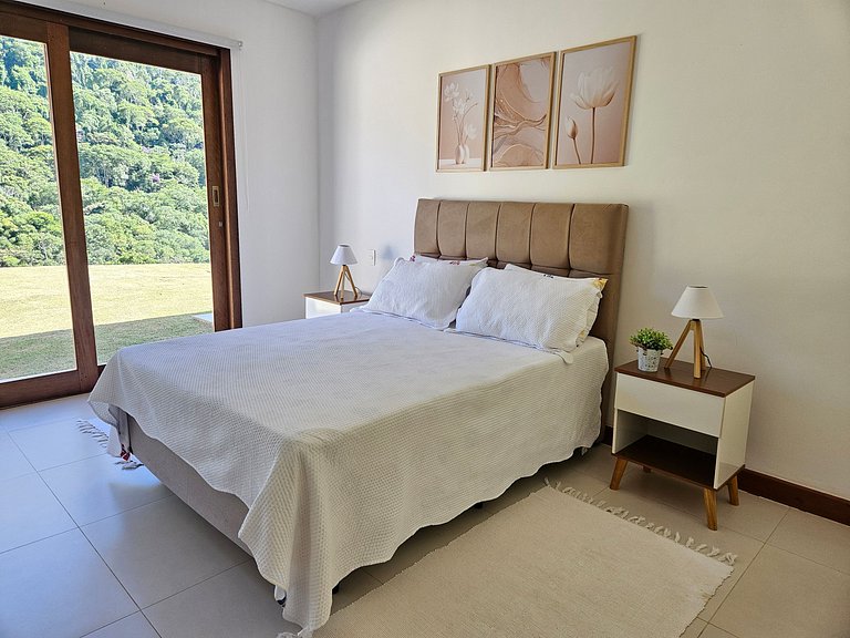 Casa Maritacas is an excellent option for those who want to enjoy nature and the attractions of Secretaria, district of Petrópolis. A new, spacious and complete house. Swimming pool, gourmet area with large table for the whole family to enjoy, large living and dining room with fireplace. Sunny and with beautiful mountain views, it is ideal for enjoying the days and nights of this beautiful region. Located in a gated community with easy access via BR040, our house has a large and very well-kept plot of land, completely fenced, excellent for children to enjoy. The house is completely flat and has 4 bedrooms, 1 suite and two bedrooms with an exclusive bathroom for each bedroom right in front. The other bedroom is an external suite with two single beds. Casa Maritacas has top-of-the-line bed and bath linen for your use, complete utensils for the kitchen and gourmet area, all ready for you to arrive and enjoy.