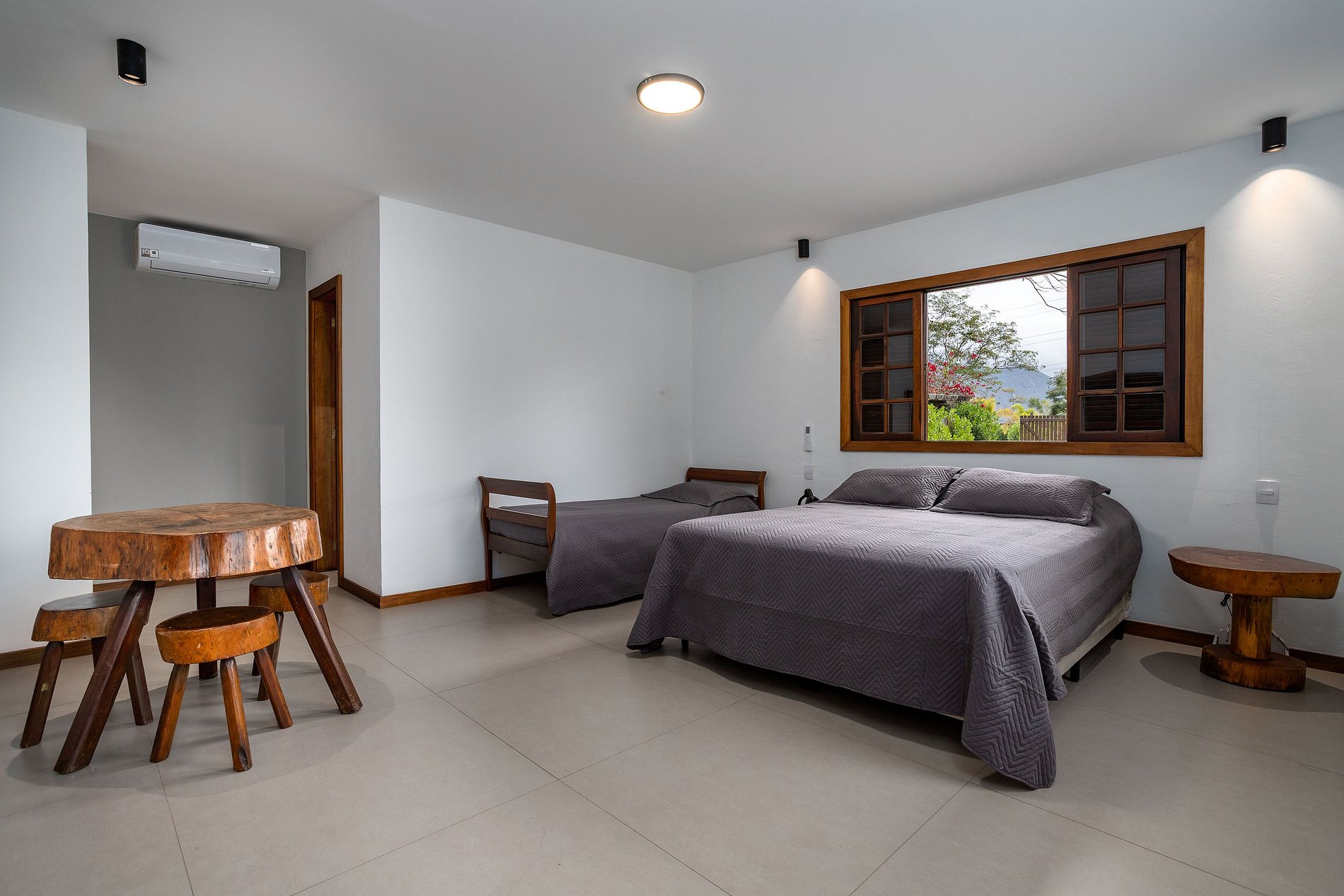 A ampla área gourmet com churrasqueira em frente à piscina e com vista indevassável para as montanhas é uma das atrações da casa. As 3 suítes contam com camas de casal queen e ar condicionado quente e frio. Duas das confortáveis suítes são na casa principal. A terceira suíte é externa, ao lado da área gourmet. Ela é ainda mais ampla e equipada com frigobar e minicopa e tem cama queen e uma cama de solteiro.