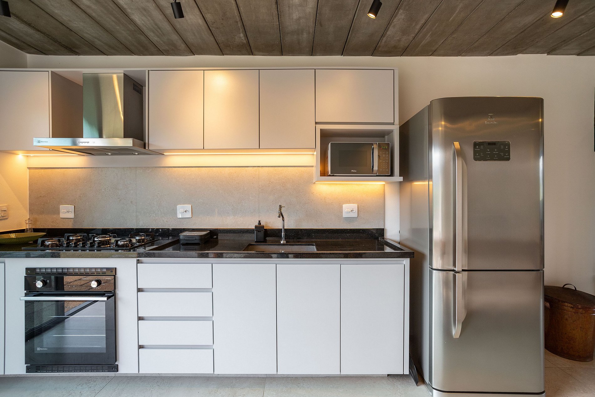 Na sala de estar integrada com a mesa de jantar e a cozinha completa é perfeita para curtir a companhia ou assistir uma TV. A lareira fechada da sala de estar é segura e aquece as noites de inverno, além de ser super charmosa.
