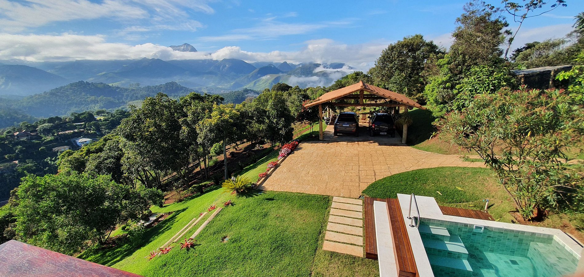 Casa muito boa. Bons lençóis, ótimo chuveiro, vista linda mesmo, cozinha completa, quartos com ar split quente e frio, sossego total. À noite o varal de luzes ao ar livre é muito agradável. E de dia a piscina e espaço de lazer são ótimos. A casa fica no topo de um morro e o acesso foi sossegado. A vista é espetacular.