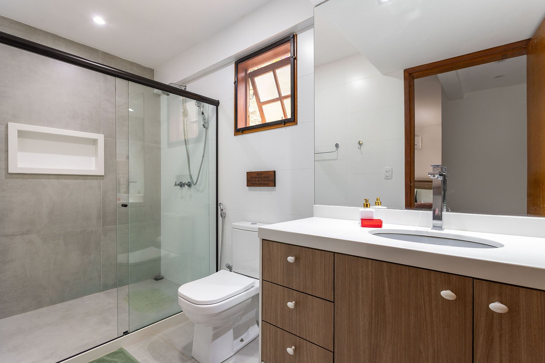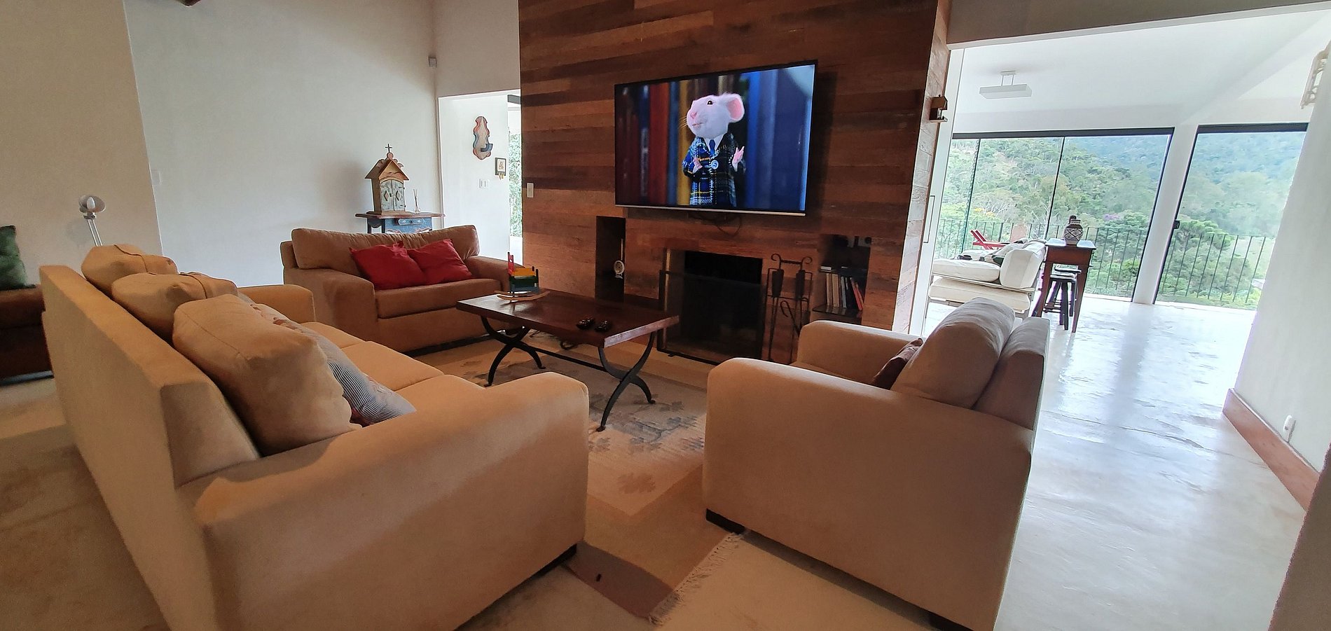 No primeiro piso da casa temos duas suítes, sala de estar, sala de TV, cozinha e banheiro. No piso superior ficam um quarto e suíte master e um deck panorâmico. A piscina, sauna e área gourmet ficam no nível do piso principal. Para chegar às salas de jogos é preciso descer um lance de escadas. Para acessar o playground é preciso descer o caminho pelo terreno com escadas ou ir de carro. Para o chalé é preciso subir escadas. Todos os quartos da casa principal contam com ar-condicionado quente e frio (exceto um deles, que é só frio), frigobar e TV. A sala de estar e a sala de TV também tem ar-condicionado quente e frio. O chalé tem quarto com lareira e TV, banheiro, copa com microondas e um lindo deck com rede e espreguiçadeiras.