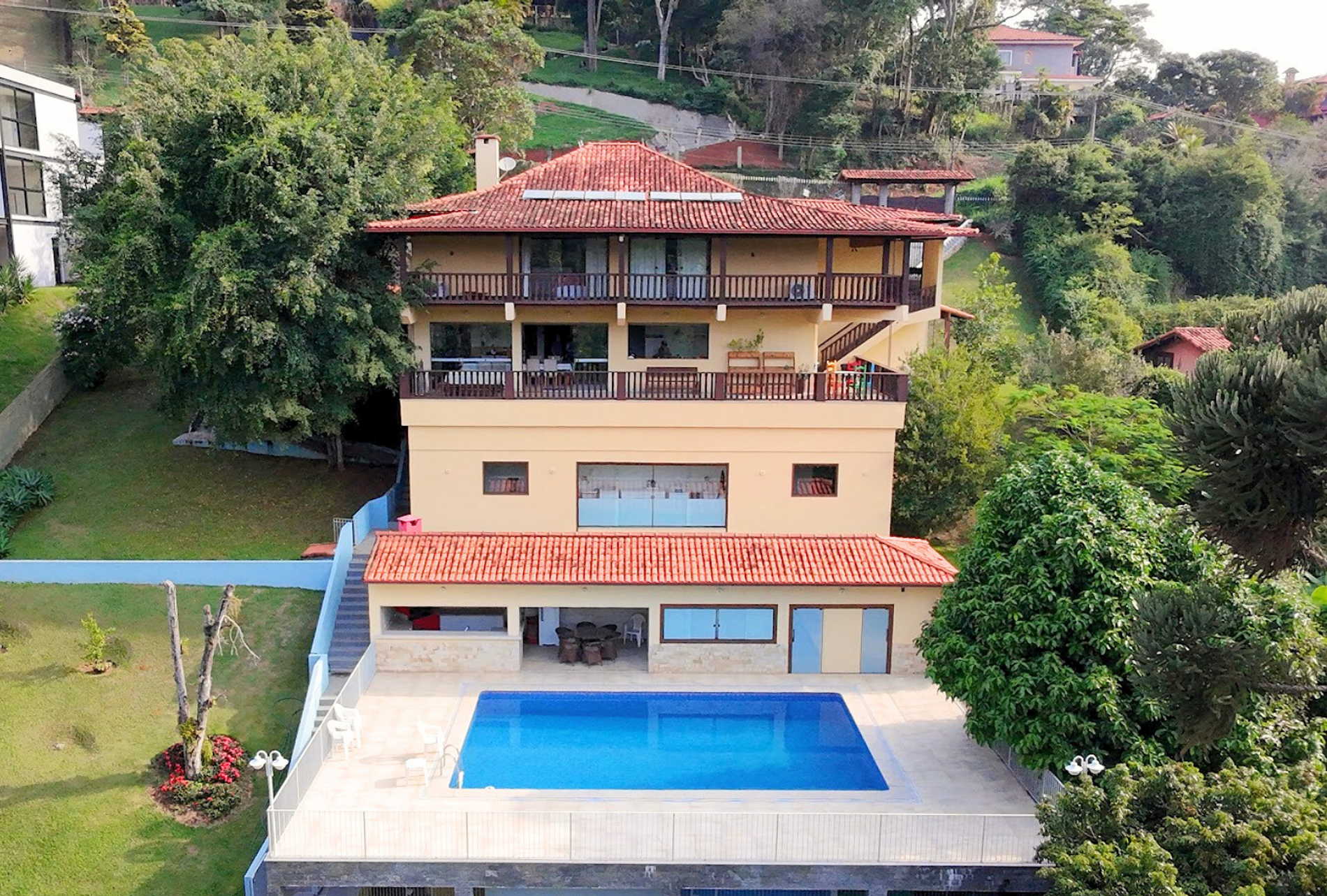 São 7 quartos, todos com ar condicionado quente e frio. São 5 suítes, uma delas com banheira. Outros dois quartos amplos com 2 banheiros servindo a eles. Grande sala de jantar integrada com a cozinha com vista indevassável para as montanhas, em destaque a Pedra de Itaipava. Lareira com duas fachadas e Sala de TV, todos estes ambientes da casa principal om ar condicionado quente e frio.