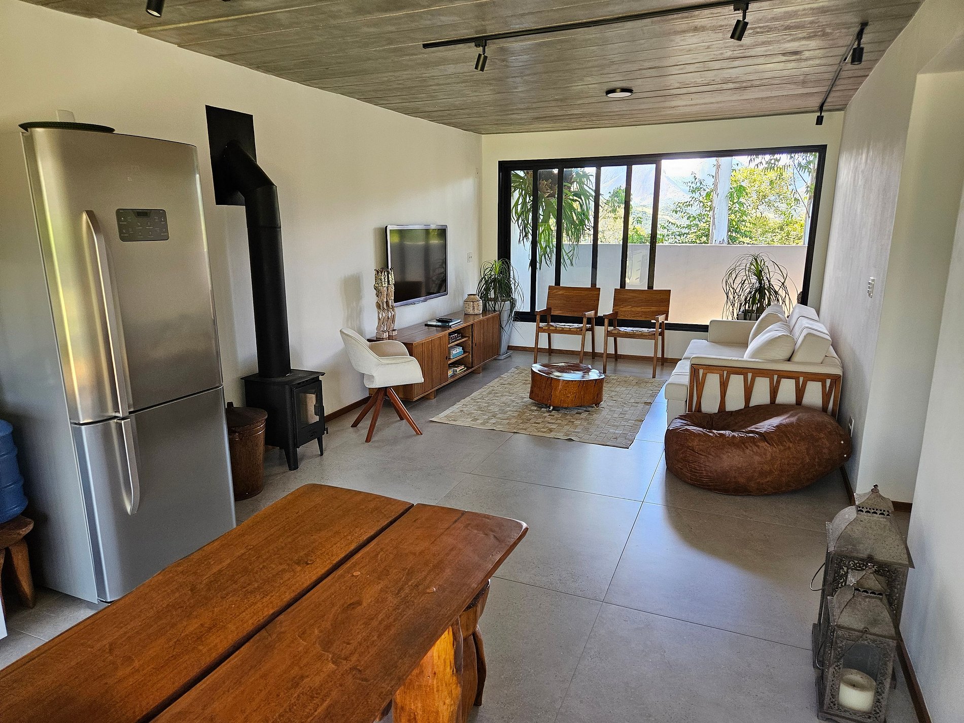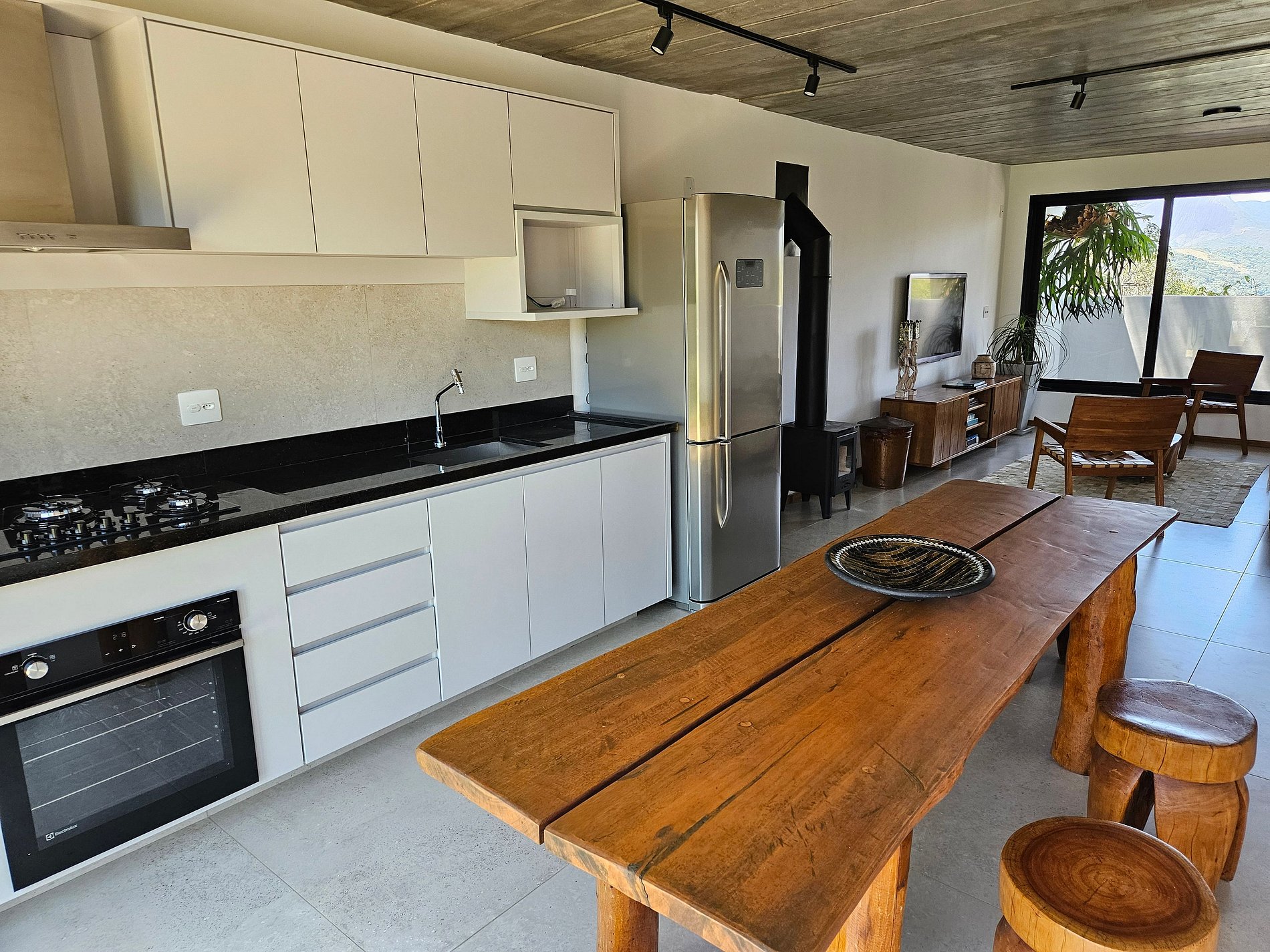 Na sala de estar integrada com a mesa de jantar e a cozinha completa é perfeita para curtir a companhia ou assistir uma TV. A lareira fechada da sala de estar é segura e aquece as noites de inverno, além de ser super charmosa.