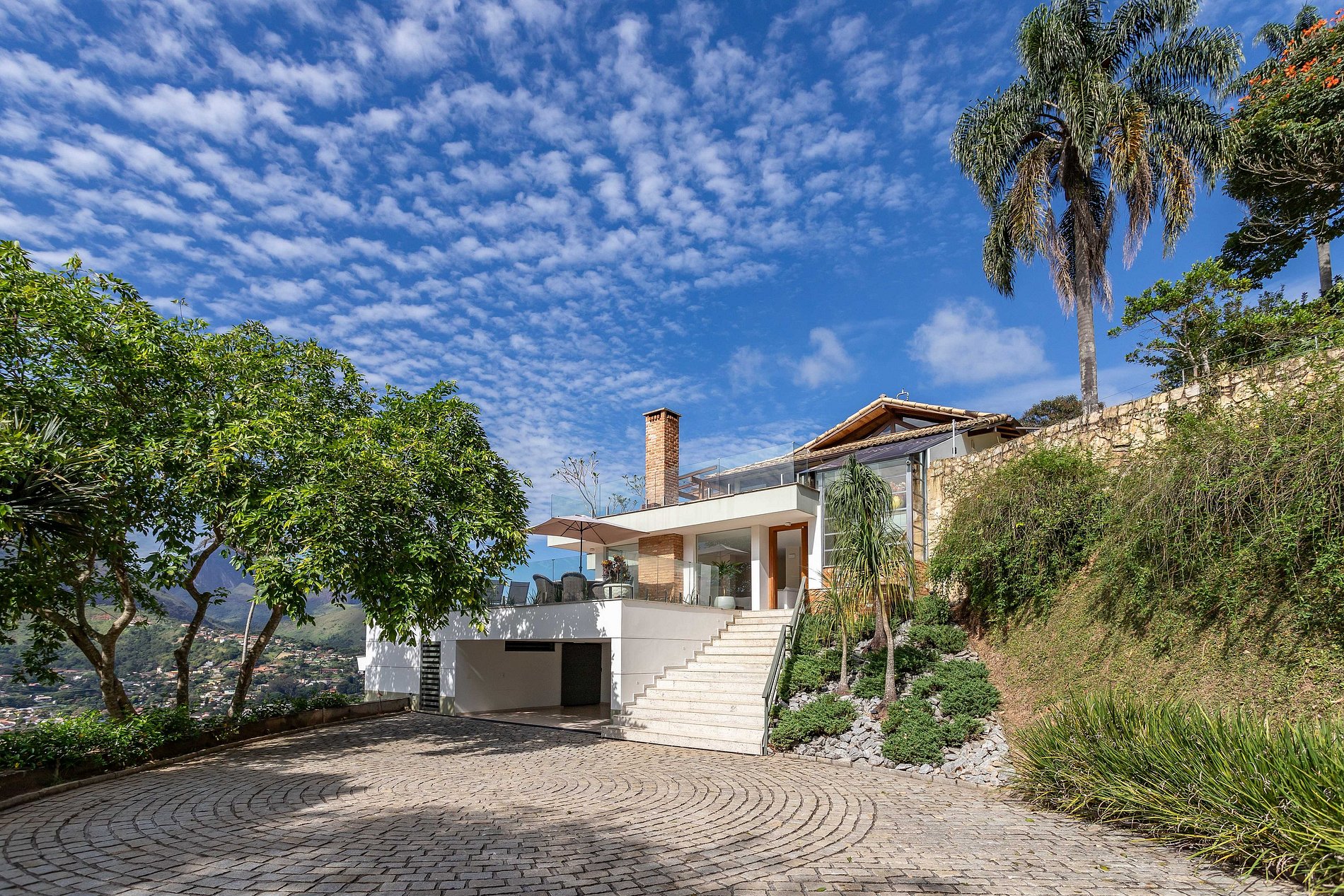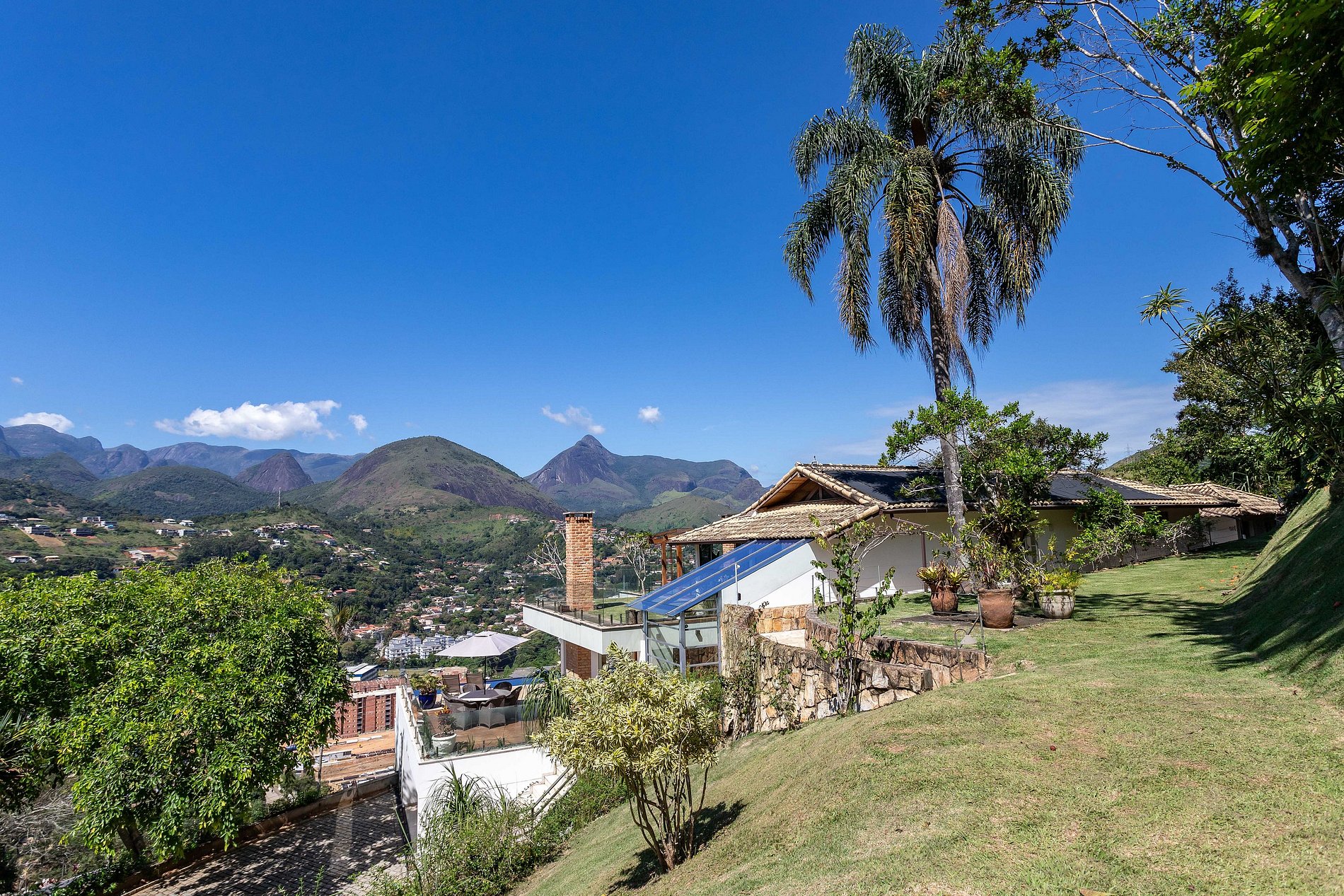 O projeto da casa explora totalmente a linda vista: piscina com borda infinita integrada à sauna toda em vidro. A suíte principal conta com uma banheira de hidromassagem e todas as suítes possuem sacadas. Duas sacadas têm redes para relaxar, além de dois terraços junto às duas grandes salas, uma em cada piso, um pergolado no jardim superior onde você vai comtemplar as lindas montanhas da região. A cozinha completa com ilha e integrada à sala de jantar é um convite para quem gosta de praticar a arte da culinária. A área gourmet estrategicamente localizada entre a cozinha e a área de lazer é perfeita para curtir o churrasco ou a pizza com a família tendo tudo sempre à mão.